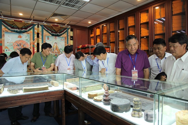 圖為(wei) 與(yu) 會(hui) 的諸位嘉賓在喜馬拉雅文庫考察、觀摩了藏醫藥古籍文獻