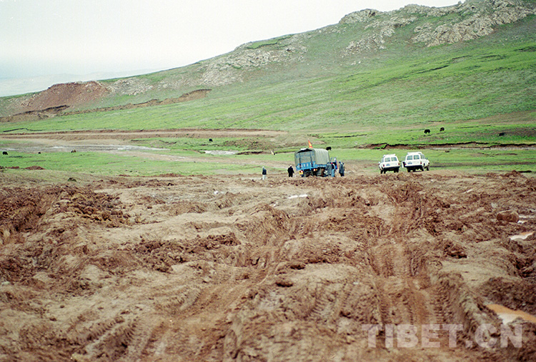 過去,由於(yu) 交通不便,從(cong) 班戈縣通往雙湖辦事處(現雙湖縣)的草原路,汽車常遭遇陷車等困難。這是過去汽車通過的一段泥濘路(唐召明2001年攝)