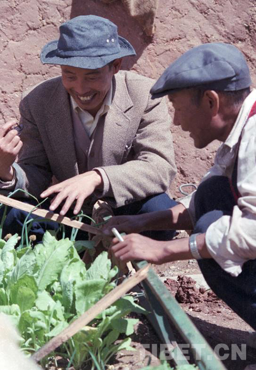 這是時任雙湖辦事處(現雙湖縣)紀律檢查委員會(hui) 書(shu) 記的熊亮兵(左),正在觀察自己在家門口通過搭塑料薄膜小篷試種的蔬菜(唐召明1987年攝)
