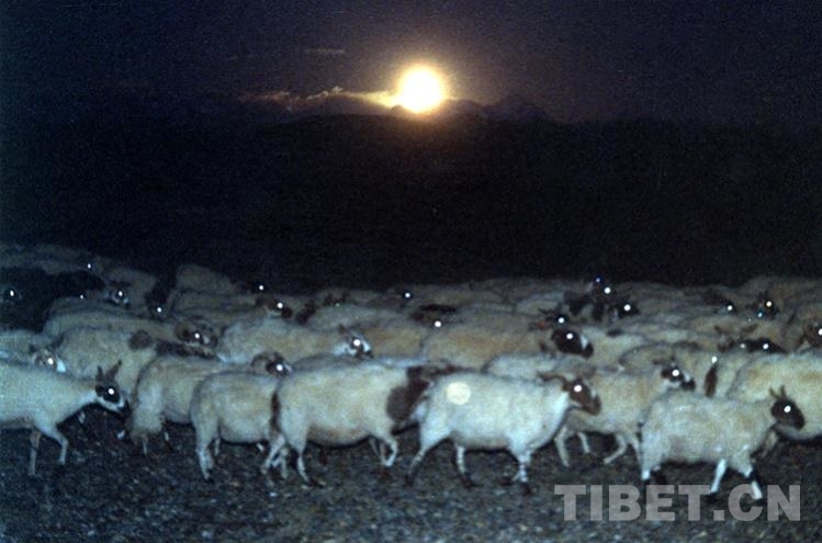 圖為(wei) 夜幕下牧歸的羊群。它們(men) 的眼睛在夜裏所發出的光,猶如“草原燈火”(唐召明1988年攝)