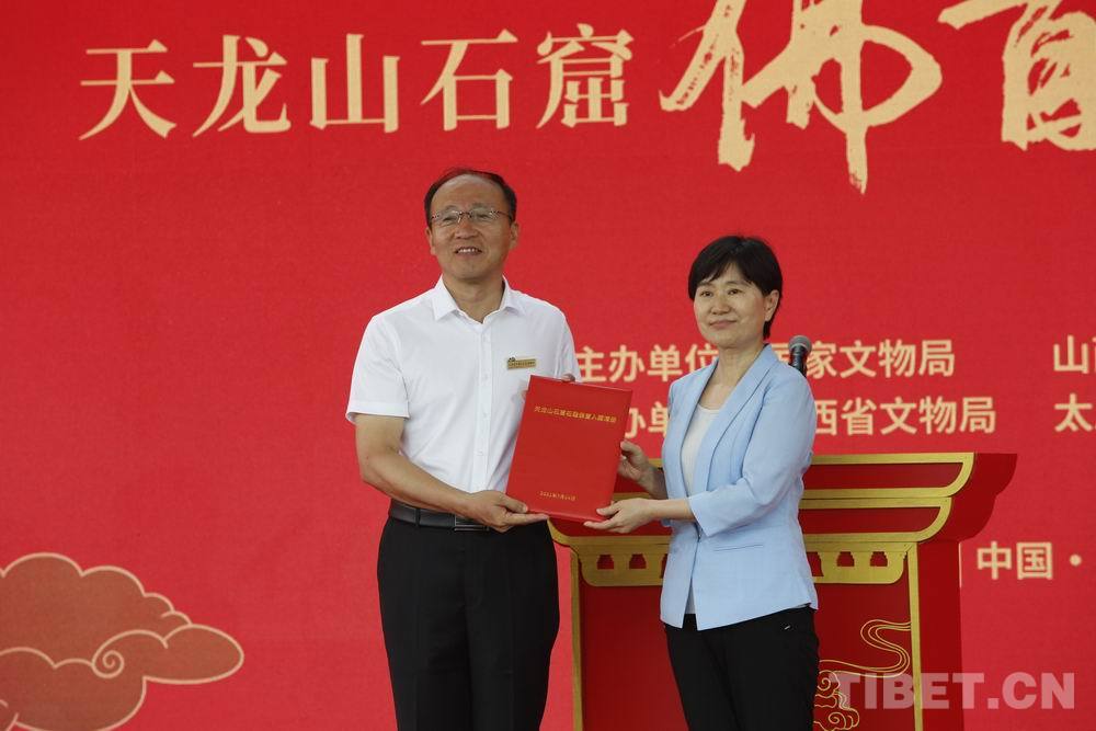 圖為(wei) 國家文物局政策法規司司長陸瓊(右)向天龍山石窟博物館館長於(yu) 灝頒發文物入藏清冊(ce)