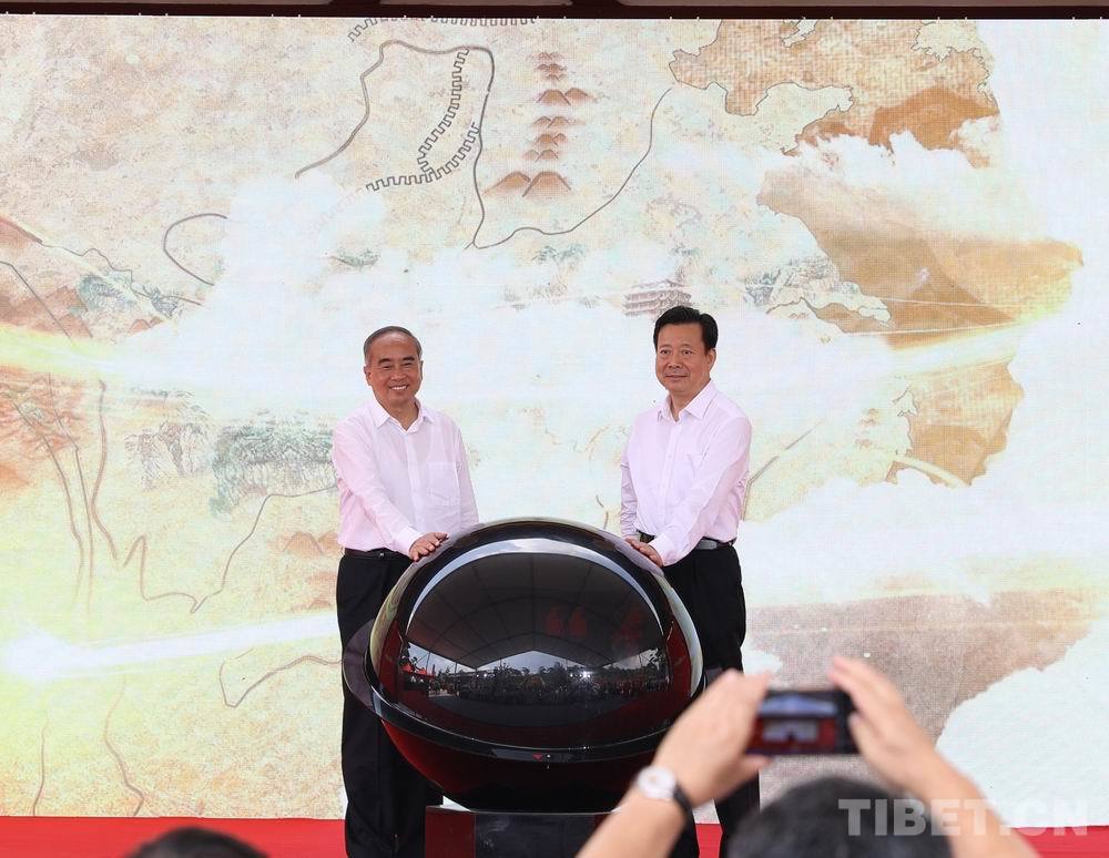 圖為(wei) 文化和旅遊部副部長、國家文物局局長李群(右)和山西省委書(shu) 記林武為(wei) 特展揭幕