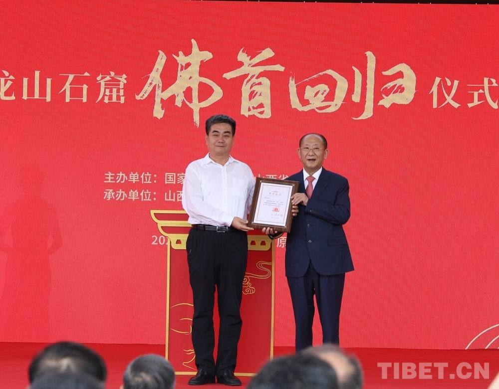 儀(yi) 式上,國家文物局政策法規司司長陸瓊向天龍山石窟博物館館長於(yu) 灝頒發文物入藏清冊(ce) 。太原市委副書(shu) 記、市長張新偉(wei) 向佛首捐贈人張榮頒發“榮譽市民”證書(shu) 。張榮表示將太原市政府頒發的獎金捐出,用於(yu) 支持文物追索返還工作。