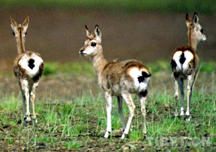藏原羚(俗稱黃羊),元月份是交配期,當年7月份是產(chan) 羔期。它們(men) 個(ge) 子不高,小巧而靈活,最明顯的標誌是屁股上有塊心形的白色印記,黑色的小尾巴搭在白屁股上,跑起來一甩一甩的,樣子十分可愛。它們(men) 少則三五隻,多則幾十隻甚至上百隻一起活動。這種動物在藏北草原最為(wei) 常見。