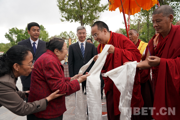 圖為(wei) 西藏自治區黨(dang) 委常委、統戰部部長,區政協黨(dang) 組副書(shu) 記、副主席旦科與(yu) 班禪互敬哈達、互致問候 攝影:王淑