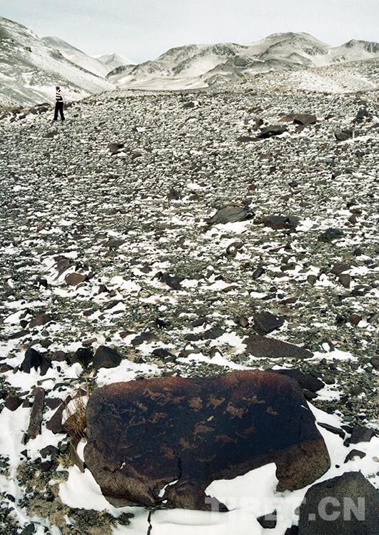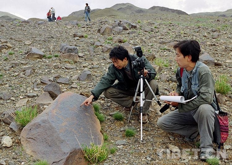 這是藏北無人區科考團科考人員在對尼瑪縣榮瑪鄉(xiang) 加林山岩畫進行科學考察(唐召明2001年攝)