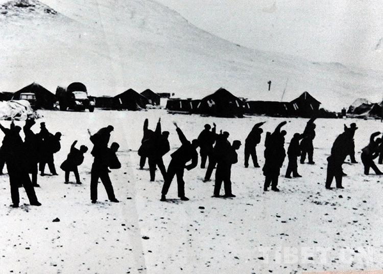 1976年,開發藏北無人區的雙湖辦事處(現雙湖縣)拓荒者在駐地做廣播體(ti) 操(唐召明翻拍照片)