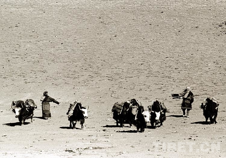 這是逐水草而居,趕著馱物犛牛正在轉移草場的雙湖辦事處(現雙湖縣)牧民人家(唐召明1987年攝)