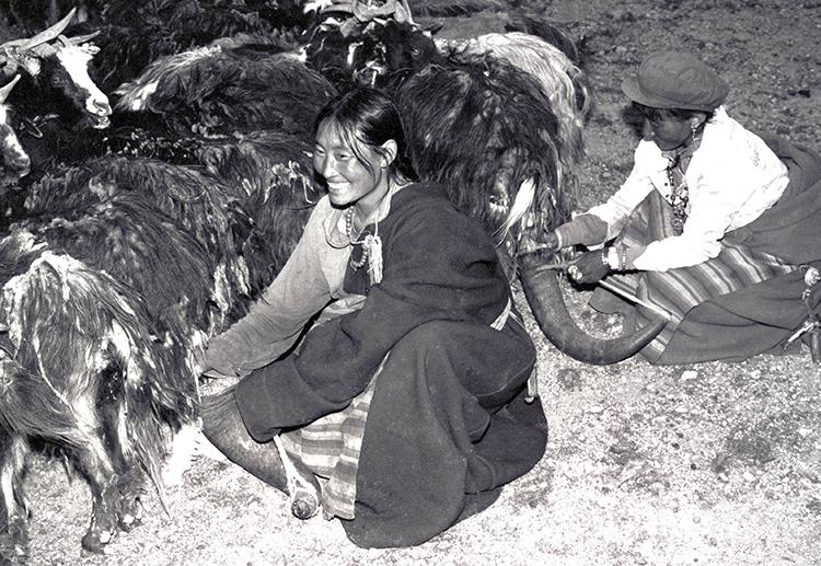 這是在雙湖辦事處北措折鄉(xiang) (現雙湖縣措折強瑪鄉(xiang) )牧女正在使用犛牛角當器皿擠羊奶(唐召明1989年攝)