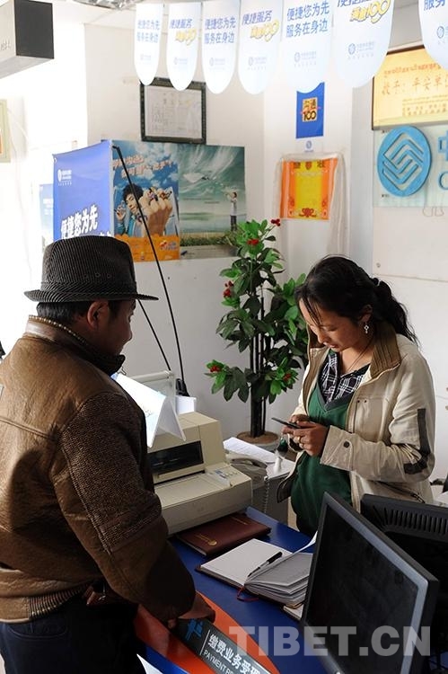 這是雙湖特別區(現雙湖縣)電信所業(ye) 務人員在辦理手機業(ye) 務(唐召明2009年8月3日攝)