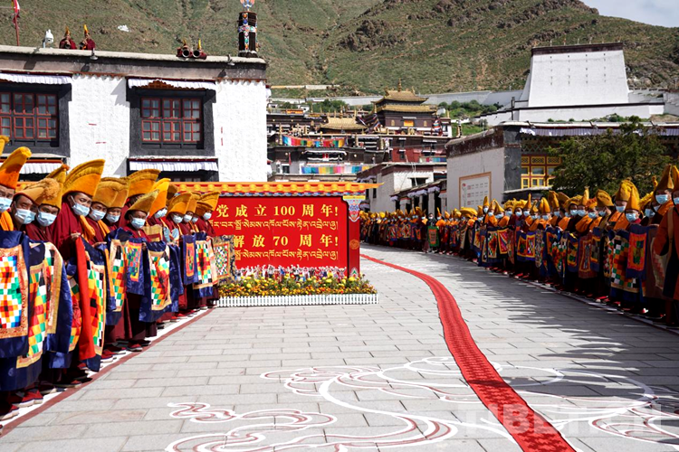當日上午,紮什倫(lun) 布寺前廣場上,信教群眾(zhong) 早早在此等候;通往紮什倫(lun) 布寺的道路兩(liang) 旁,手持法器的僧眾(zhong) 以藏傳(chuan) 佛教最高禮儀(yi) 迎接班禪。