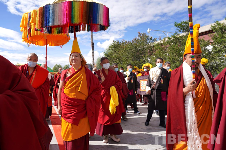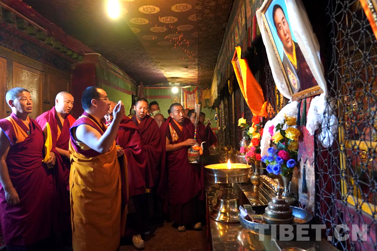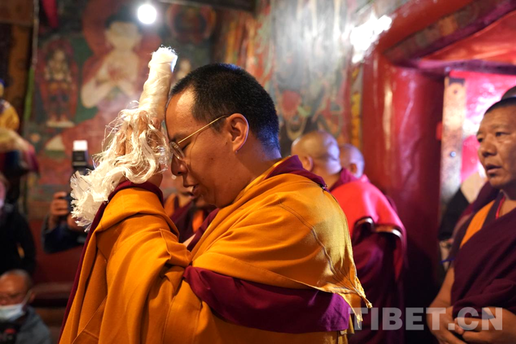 當日下午,班禪登上拉讓日光殿寶座,接受紮什倫(lun) 布寺管委會(hui) 僧人成員、高僧的朝拜,為(wei) 他們(men) 摸頂賜福,並帶領高僧集體(ti) 誦經祈禱。