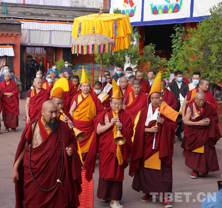桑煙嫋嫋、法號齊鳴,班禪在紮什倫(lun) 布寺僧人儀(yi) 仗隊簇擁下緩步走進措欽大殿,邊走邊向僧俗信眾(zhong) 揮手致意,頷首微笑,回應熱切期盼。