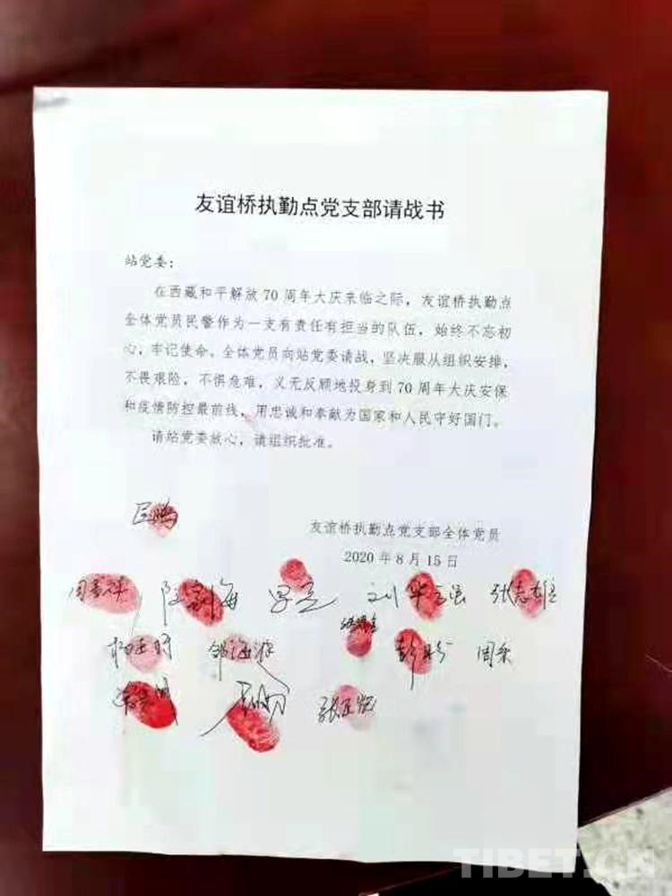 8月15日,聶拉木出入境邊防檢查站友誼橋執勤點18名黨(dang) 員民警在接受抗疫命令後,18名隊員在界碑前列隊,舉(ju) 起右拳,鄭重宣誓,踴躍請戰。“在疫情防控工作中,我自願申請參與(yu) 到國門一線的疫情防控工作,到口岸一線去,這是我的職責和使命……”剛分配到單位的新警李東(dong) 洪在請戰書(shu) 中寫(xie) 道。