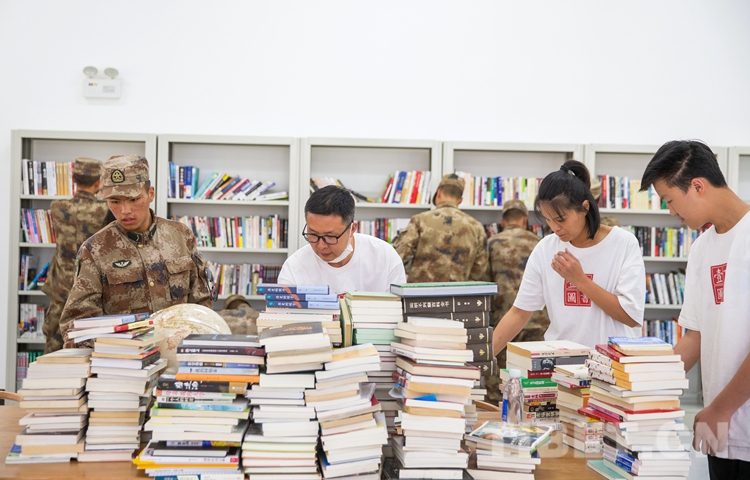 圖為(wei) 誌願者與(yu) 官兵一同分類書(shu) 籍