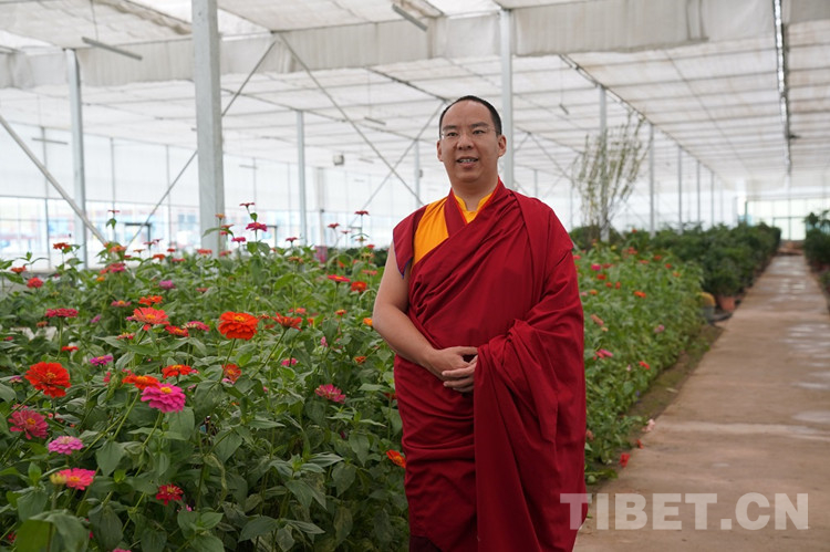 圖為(wei) 班禪在溫室大棚鮮花前留影 攝影:王淑