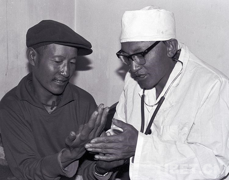 這是文部辦事處(現尼瑪縣)衛生院院長羅桑多吉正在為(wei) 牧民患者診治疾病(唐召明1987年攝)
