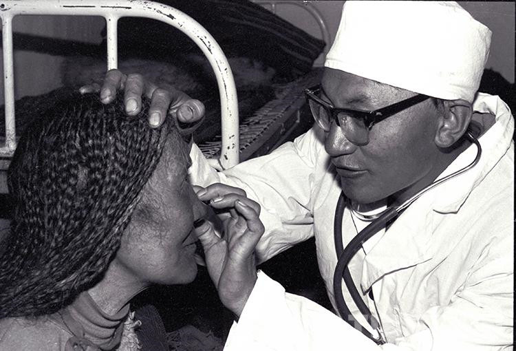 這是文部辦事處(現尼瑪縣)衛生院院長羅桑多吉正在為(wei) 住院牧民患者診治眼睛疾病(唐召明1987年攝)