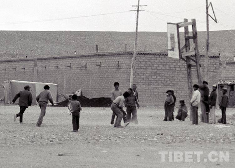 這是在文部辦事處(現尼瑪縣)衛生院房前打籃球玩耍的孩子們(men) (唐召明1987年攝)
