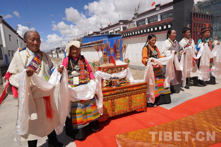 位於(yu) 薩迦縣扯休鄉(xiang) 東(dong) 北部的嘎吉林村,是庫區搬遷新村,2020年3月,全村139戶769人從(cong) 海拔4000多米的土坯房搬遷到了這裏海拔3800米的新房。得知班禪要來的喜訊,嘎吉林村村民及信教群眾(zhong) 身著節日盛裝、手捧潔白哈達,一早就自發聚集在村廣場上迎候班禪。村民旦珍高興(xing) 地對記者說道:“自從(cong) 搬到這兒(er) 以後,政府給我們(men) 每人分了5.5畝(mu) 田地,每戶人家都享受著國家搬遷優(you) 惠政策,住上了福利幸福房。尤其是有了村裏的集體(ti) 合作社,再也不用像以前那樣單打獨鬥各家做各自的事了。現如今,無論是生活還是經濟收入都一年比一年好。”