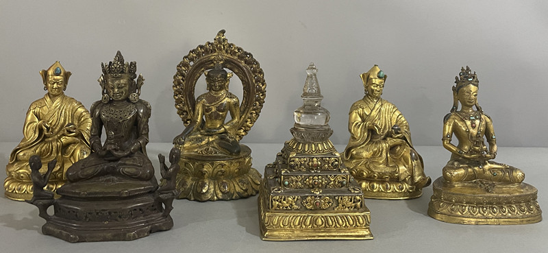 其中,5件金銅佛造像和1件銅鎏金水晶嵌寶石供養(yang) 塔製作工藝精良,專(zhuan) 家建議暫定為(wei) 三級文物。特別是1尊明末清初的黃銅同侍從(cong) 無量壽佛造像,呈現出顯著漢藏融合風格,其六麵形台座多見於(yu) 漢藏風格唐卡與(yu) 壁畫,在銅造像中較為(wei) 罕見。
