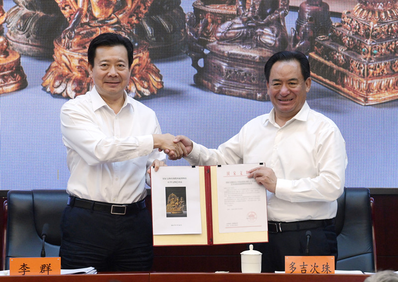圖為(wei) 文化和旅遊部副部長、國家文物局局長李群(左)與(yu) 西藏自治區人民政府副主席多吉次珠交接文物劃撥清冊(ce) 國家文物局供圖 攝影:新華社記者 李賀