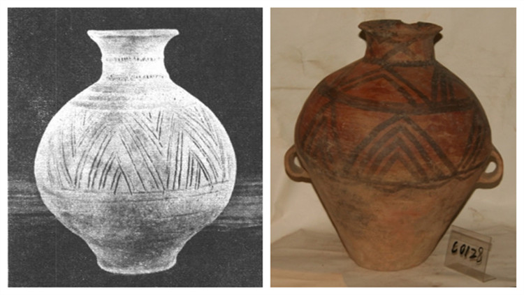 左圖為(wei) 卡若遺址出土的陶罐 圖片翻拍自《昌都卡若》考古發掘報告;右圖為(wei) 甘肅馬家窯文化三角折線紋彩陶壺 圖片來源於(yu) 馬家窯文化官網