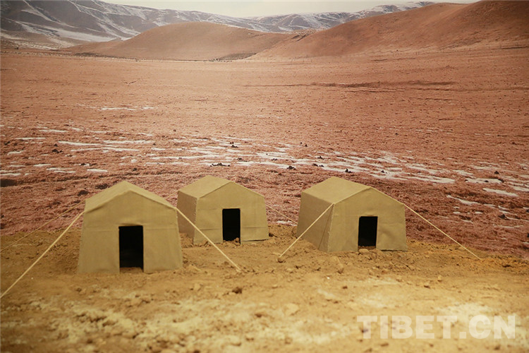 展廳內(nei) 三頂帳篷的模型,模擬了當年金銀灘草原上的場景。