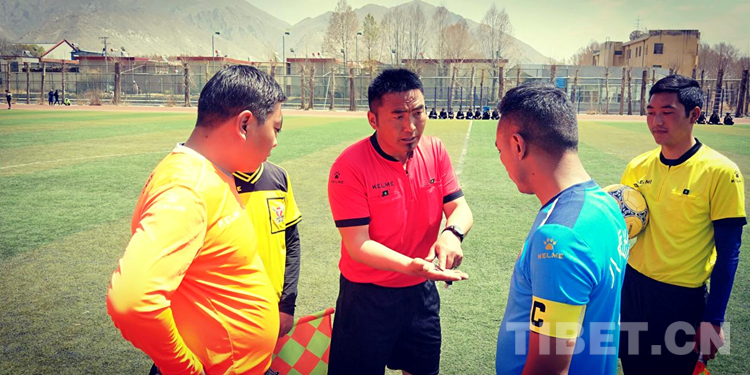 圖為(wei) 旺堆次仁給即將上場比賽的雙方隊長強調規則 攝影:晉美