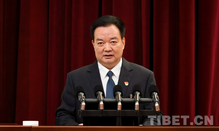 圖為(wei) 西藏自治區黨(dang) 委書(shu) 記王君正代表中國共產(chan) 黨(dang) 西藏自治區第九屆委員會(hui) 向大會(hui) 作報告 攝影:趙耀