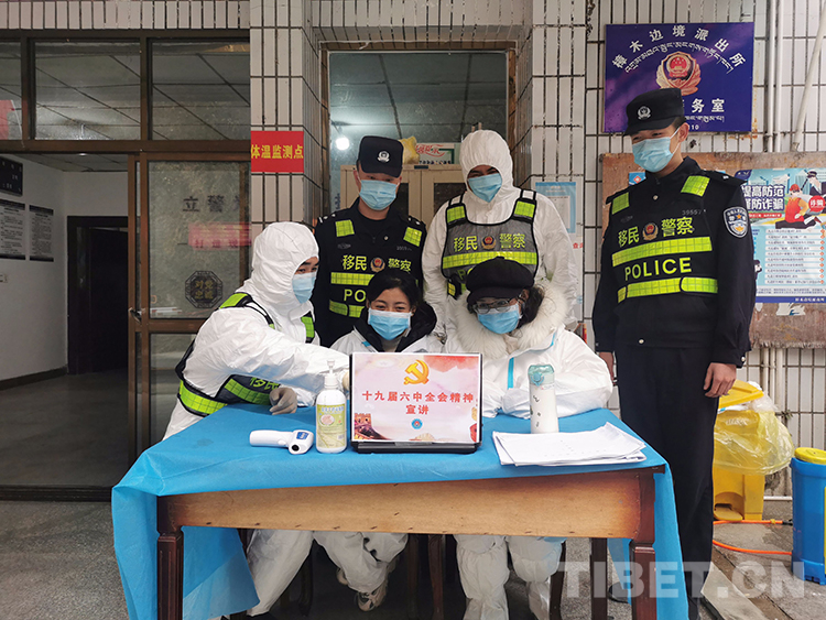 圖為(wei) 樟木邊境派出所第三警務室執勤民警與(yu) 口岸醫院醫護人員共同學習(xi) 十九屆六中全會(hui) 精神