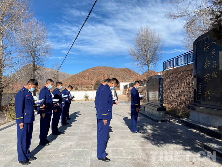 圖為(wei) 貢覺縣駐防分隊祭奠英烈後重溫入黨(dang) 誓詞