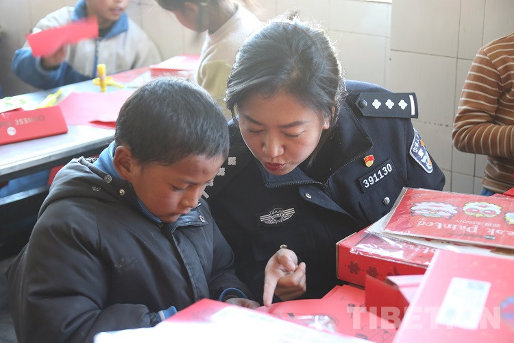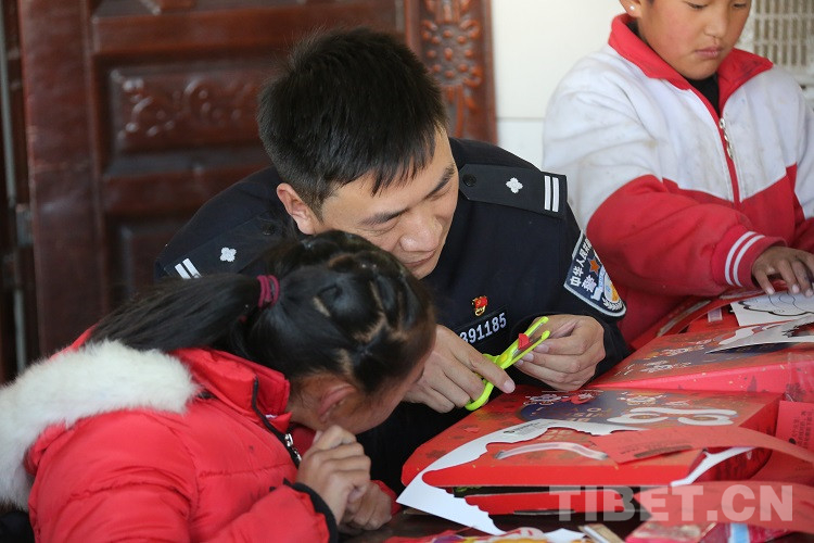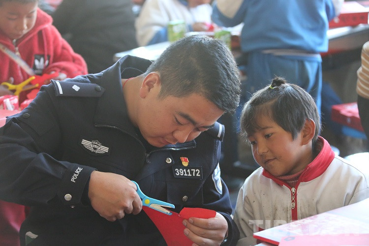 圖為(wei) 拉薩邊檢站民警和孩子們(men) 共同完成手工剪紙 攝影:王佳豪