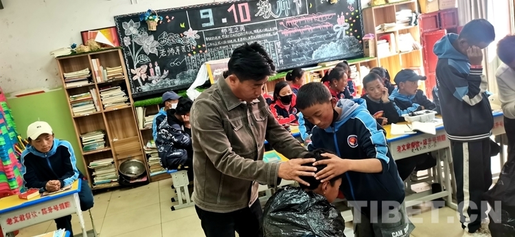 圖為(wei) 薩迦縣中學理發社學生在老師指導下給其他學生剪頭發