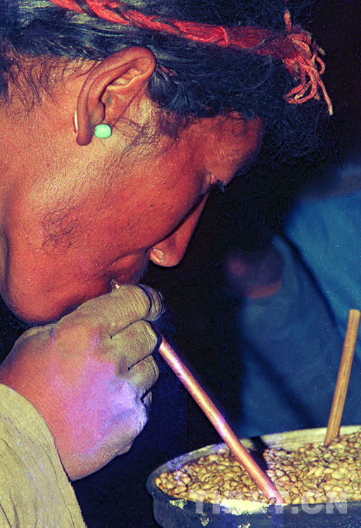 這是日喀則地區(現日喀則市)定日縣一牧民正在吸吮剛釀製好的青稞酒(唐召明1988年攝)