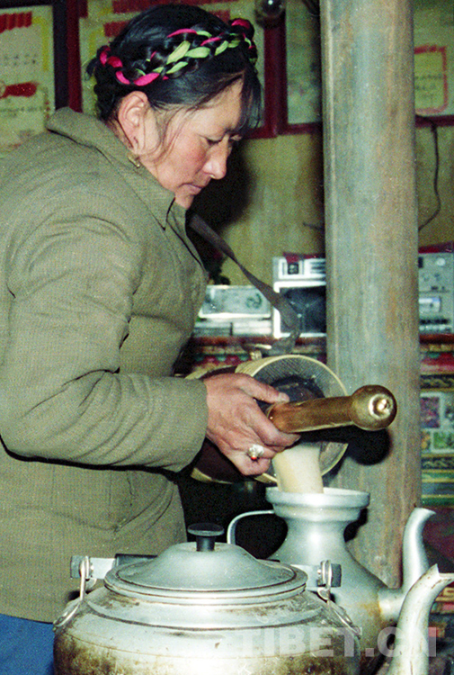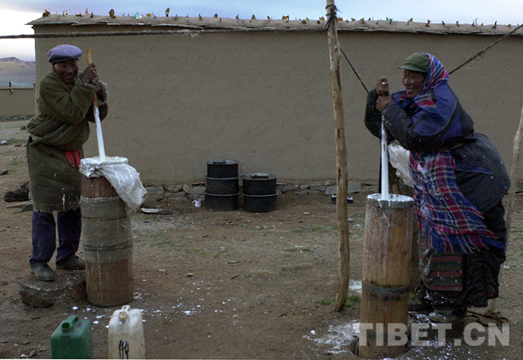 這是那曲地區雙湖特別區(現那曲市雙湖縣)嘎措鄉(xiang) 牧民正在打製酥油(唐召明2001年7月15日攝)