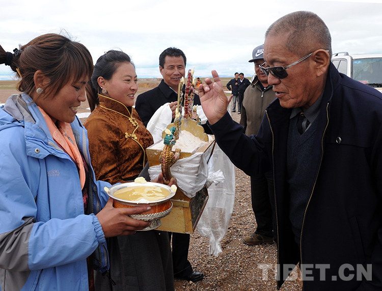 這是那曲地區雙湖特別區(現那曲市雙湖縣)的青年在向來訪的老領導洛桑丹珍敬青稞酒(唐召明2013年7月25日攝)