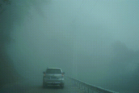 再次回眸,此時白雪墨林好似一幅水墨畫,盤山公路幾乎隱沒於(yu) 漫天雲(yun) 霧之中。