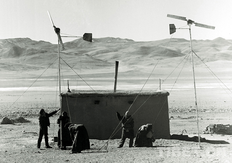 這是那曲地區風能試驗站技術人員在對那曲地區雙湖辦事處(現那曲市雙湖縣)嘎措鄉(xiang) 的風力發電機進行檢修保養(yang) (唐召明1988年攝)