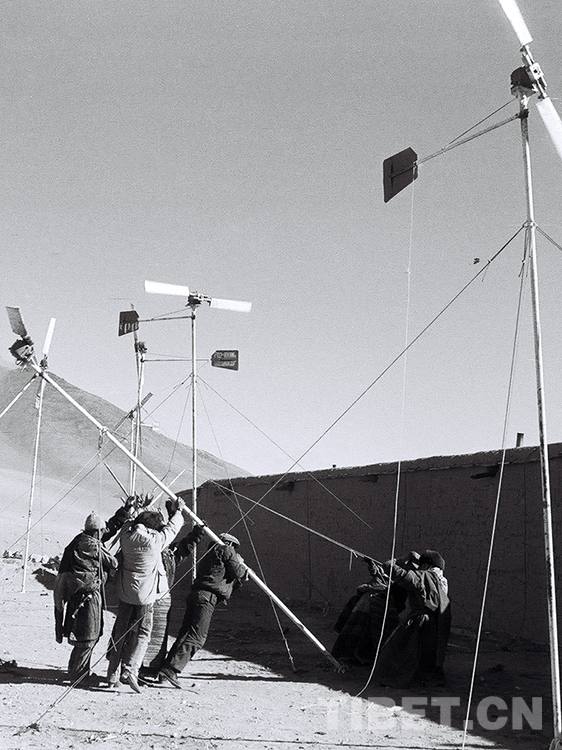 這是那曲地區風能試驗站技術人員正在豎起剛為(wei) 那曲地區雙湖辦事處(現那曲市雙湖縣)嘎措鄉(xiang) 所檢修保養(yang) 的風力發電機(唐召明1988年攝)