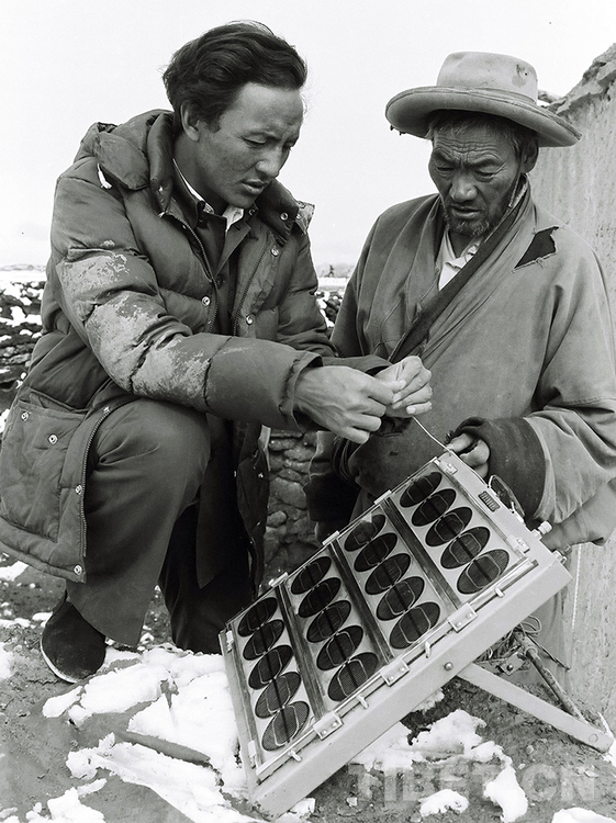 這是那曲地區風能試驗站站長次真在風力發電機試點鄉(xiang) 的那曲地區那曲縣(現那曲市色尼區)德吉鄉(xiang) 指導牧民群眾(zhong) 使用太陽能矽光電池板(唐召明1987年攝)