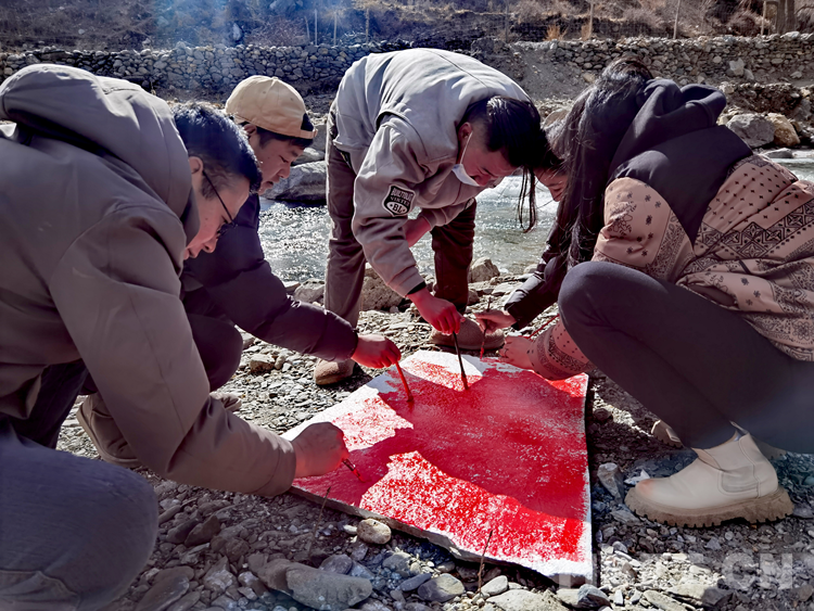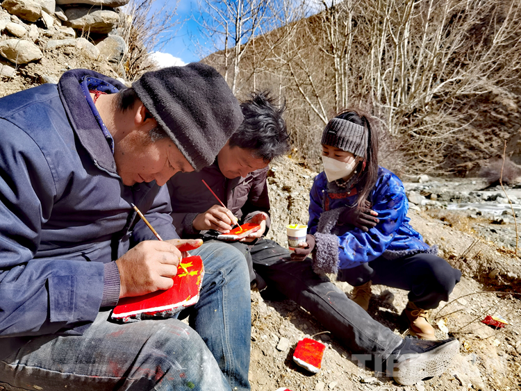 圖為(wei) 卡熱鄉(xiang) 6個(ge) 村(居)第一書(shu) 記及邊據村駐村工作隊正在石頭上手繪國旗