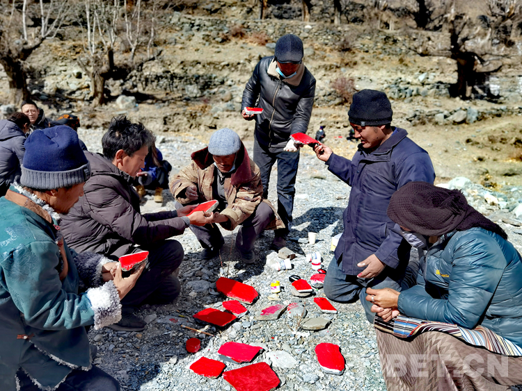 圖為(wei) 黨(dang) 員和群眾(zhong) 在柴火旁烤幹石頭畫上的顏色