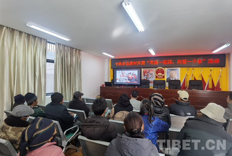 圖為(wei) 卡熱鄉(xiang) 6個(ge) 村(居)第一書(shu) 記和邊據村黨(dang) 員、群眾(zhong) 代表正在觀看講述西藏各族人民愛護國旗的視頻
