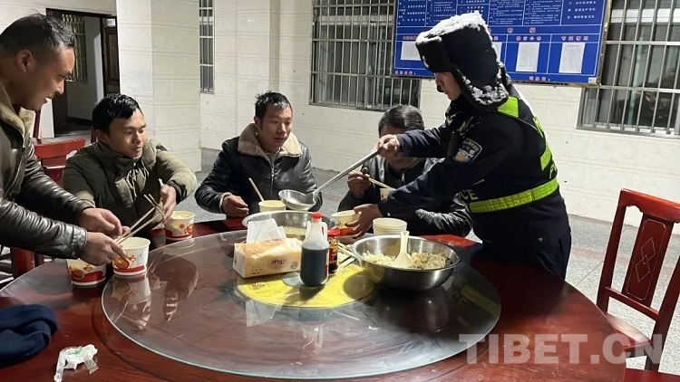 圖為(wei) 民警們(men) 和被困人員返回檢查站後吃上了熱騰騰的飯菜
