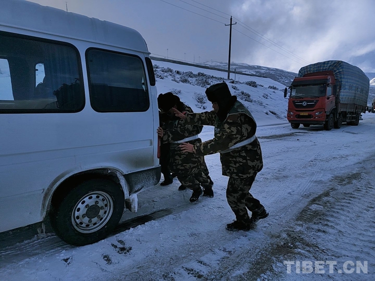 圖為(wei) 武警官兵幫助過往車輛通過冰雪路段