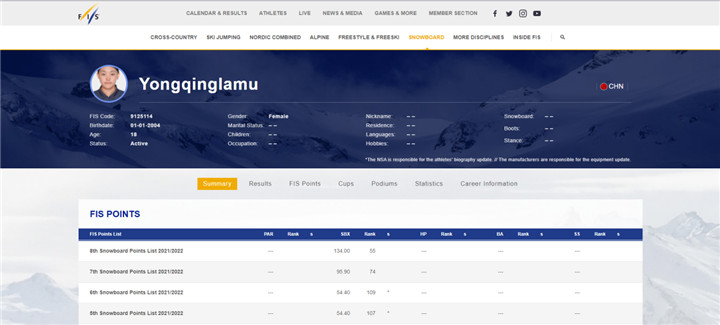 圖為(wei) 國際雪聯官網運動員擁青拉姆介紹