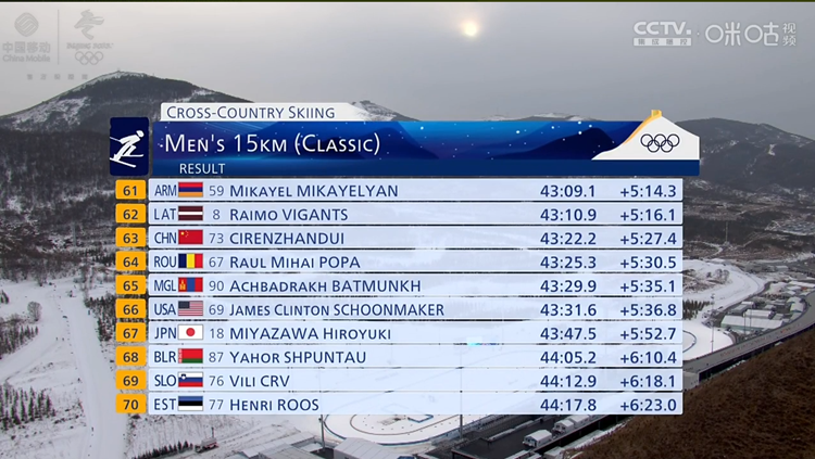 據悉,本場比賽共有99名運動員參加,每間隔30秒出發一人,運動員需在全長7.5公裏的越野滑雪賽道上完成兩(liang) 圈比賽。次仁占堆以第73名的序位出發,與(yu) 次仁占堆一起參賽的中國選手還有尚金財、哈得斯·巴德裏汗、劉榮勝。最終尚金財排名第41位,劉榮勝排名第47位,哈得斯·巴德裏汗排名第57位,次仁占堆排名第63位。
