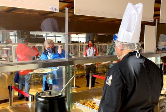 圖為(wei) 巴赫為(wei) 冬奧村餐飲服務點讚 圖片來源:中新網