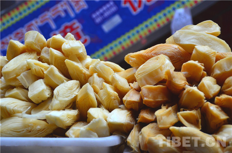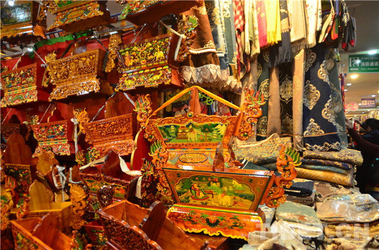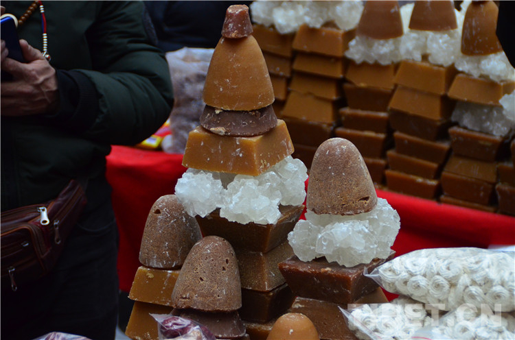 商城一層是一個(ge) 年貨市場,一層一層壘起來的切瑪盒、不同顏色和形狀的卡塞、堆成寶塔形狀的紅糖、花盆裏裝著的青稞苗……在那拿出皮尺量的,是在購買(mai) 香布,藏曆新年到來時家家戶戶都會(hui) 更換新的香布。